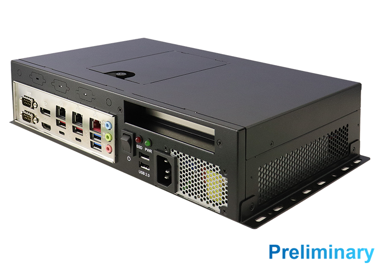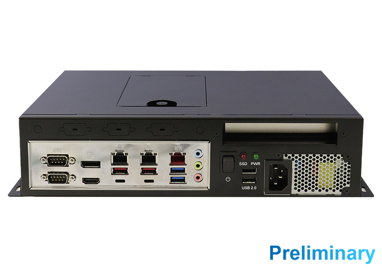 | Rear-side Panel I/O | 1x AC-inlet 1x Power switch (rocker switch) 1x Power LED indicator 1x Storage LED indicator 2x USB2.0 ports 2x DB9 for COM#1/COM#2 (COM#1 with RS232/422/485, select from BIOS) 1x DP + 1x HDMI 2x (USB Type-C + USB3.2 Type-A + RJ45 connector) 1x (Dual USB3.2 Type-A + RJ45 connector) 1x 3-in-1 audio jack 2x Antenna holes |