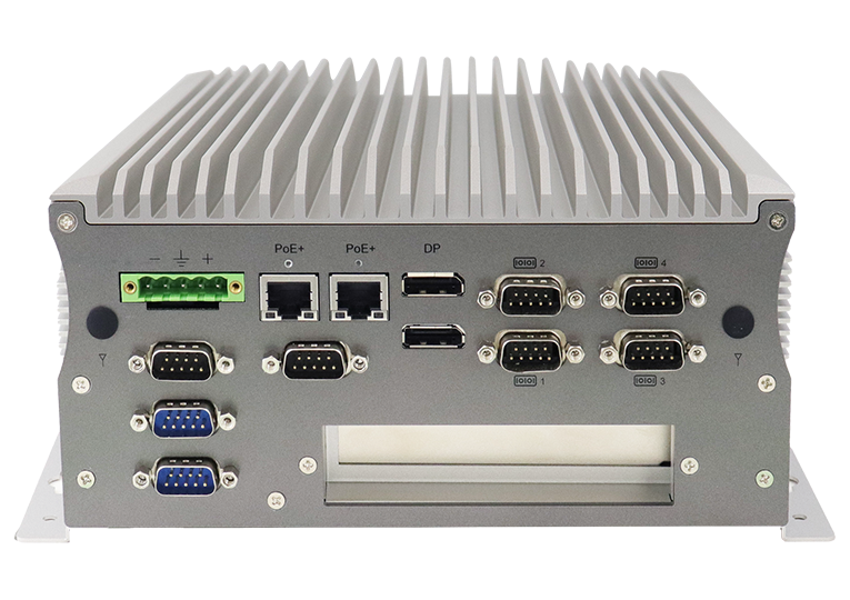 | Front Panel External I/O | 2x RS232/422/485 COM ports 4x RS232 COM ports 2x DisplayPort 2x RJ-45 GbE ports (supports 802.3at PoE+) 1x 5-pins DC-in terminal block type for +24V 2x Antenna holes 1x Expansion slots |