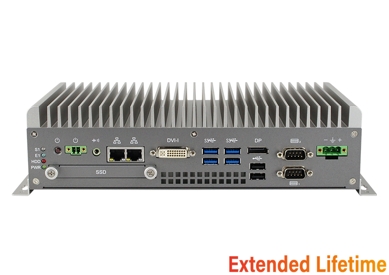 | Rear Panel External I/O | 1x DVI-I + 1x DisplayPort connector 1x Audio jack for Line-out 4x USB 3.0 ports, 2x USB 2.0 ports 1x Red HDD LED, 1x green power LED 2x Error LED by programming 1x power button 1x 2-pin terminal block for external power button 1x RS232/422/485 port for COM#1 1x RS232 port for COM#2 2x RJ45 Gigabit Ethernet port 1x 3-pin DC-in terminal block for 24V (±10%) |